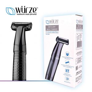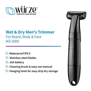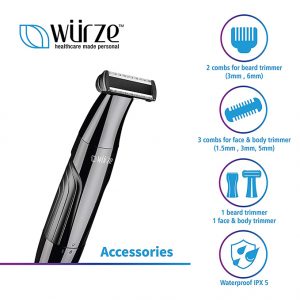 This latest design beard trimmer has LR6, AA, 1.5V Battery powered. Unique wheel control the comb with different cutting lengths in precision. 5. 3 x combos for face and body trimmer (1.5mm, 3mm, 5mm). 2 x combos for beard trimmer (3mm, 6mm). It is water resistant (IPX 5) and can be used under the shower. Use the brush to remove any stuck hair etc. after every use. This product has a six month warranty for manufacturing defects.